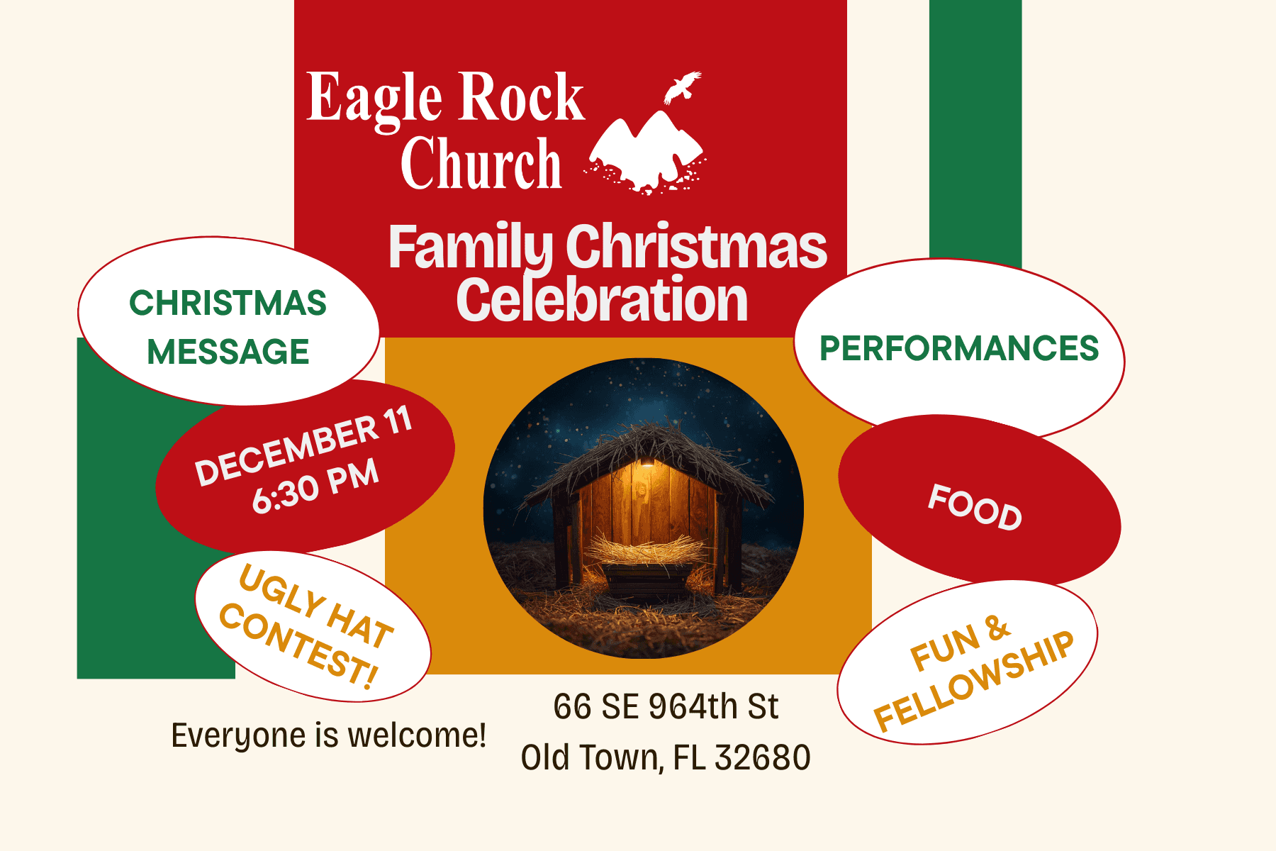 Eagle Rock Church Family Christmas Celebration Join us on December 11 at 6:30 PM at the church for a joyful evening with our entire church family! We’ll share the Christmas message, enjoy performances, great food, and warm fellowship, plus a fun Ugly Christmas Hat Competition! Wear your most festive (or funniest) Christmas hat for a chance to win. Bring your family, invite a friend, and come ready to celebrate the birth of our Savior—together.